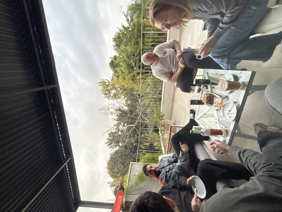 - "An outdoor scene on a balcony or patio in Ramat HaSharon, Israel, depicts five individuals gathered around a glass-top coffee table under a black slatted pergola" by FM-mfRp53, licensed under CC BY 4.0