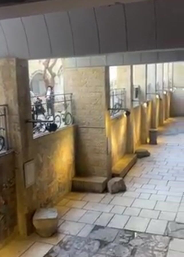 tiled walkway that is partially covered. There are stone blocks on either side of the walkway, and a low railing that separates the walkway from the outside. There is a person walking with a bicycle on the other side of the railing. The walkway extends to the right, where there are a series of pillars. The lighting is warm, and the overall tone is peaceful.
