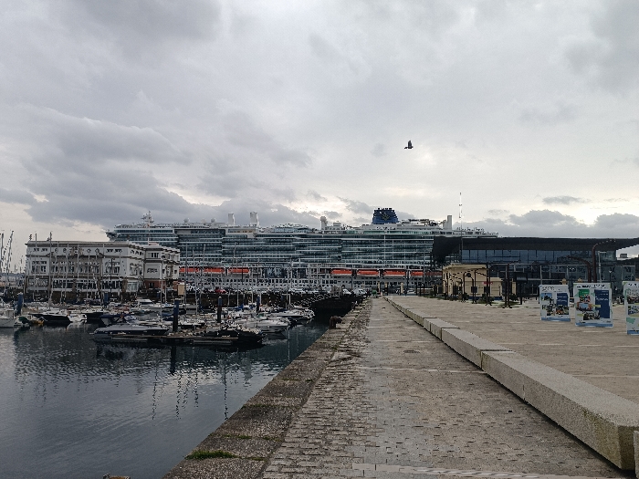 The image depicts a port area in A Coruña, Spain, under an overcast sky with dense grey clouds. In the foreground, a wide, grey paved quay, constructed of concrete slabs and cobblestones, extends from the lower right towards the middle-left distance. A long, rectangular, light-grey concrete barrier or bench runs parallel to the right edge of this quay. To the left of the quay, a marina is visible, densely populated with numerous moored sailboats and smaller motorboats, their masts and rigging forming a complex pattern. The water in the marina exhibits reflections of the boats and the sky. Behind the marina, a row of multi-story buildings with white facades, traditional architectural elements, and multiple windows separates the smaller vessels from a larger ship. Dominating the background is a large, multi-deck cruise ship, predominantly white with grey accents, docked parallel to the city. The ship features numerous passenger cabins with balconies and windows, and a series of orange lifeboats are visibly suspended along its side. A prominent blue funnel is situated on its upper deck structure. To the right of the cruise ship, a modern building with dark glass facades and a flat roof is discernible. On the paved quay in the mid-right, several vertical informational banners or posters, displaying images and text, are mounted on stands. A single, dark bird is captured in flight in the upper center-right portion of the sky. No human figures are present in the scene.