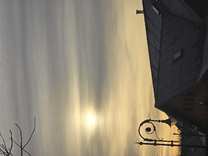 The image depicts an outdoor urban scene in Bankya, Bulgaria, at either sunrise or sunset. The upper two-thirds of the frame are occupied by a sky exhibiting a horizontal gradient from a bright, diffused yellow-orange light on the left, where the sun is a prominent, hazy white disc, to a muted grey-blue at the top. Horizontal stratiform cloud formations are visible throughout the sky. In the lower third, building structures and an active streetlight are silhouetted. A large, dark-shingled pitched roof with two rectangular skylights and a single metal chimney stack is centrally positioned on the right. Below this roofline, a building facade with a dark wooden finish and a multi-paned rectangular window is partially visible. To the left, a tall, ornate street lamp, constructed from dark metal, features elaborate scrollwork at its peak and an illuminated glass fixture below, casting a soft, warm glow. A secondary, lower streetlight fixture is partially visible behind it. Bare tree branches are silhouetted against the sky in the upper left corner. No human subjects or active interactions are present.