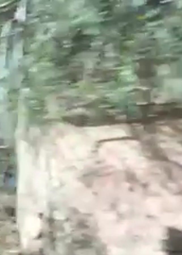 A car drives by a stop sign and through a puddle on a road with palm trees on either side