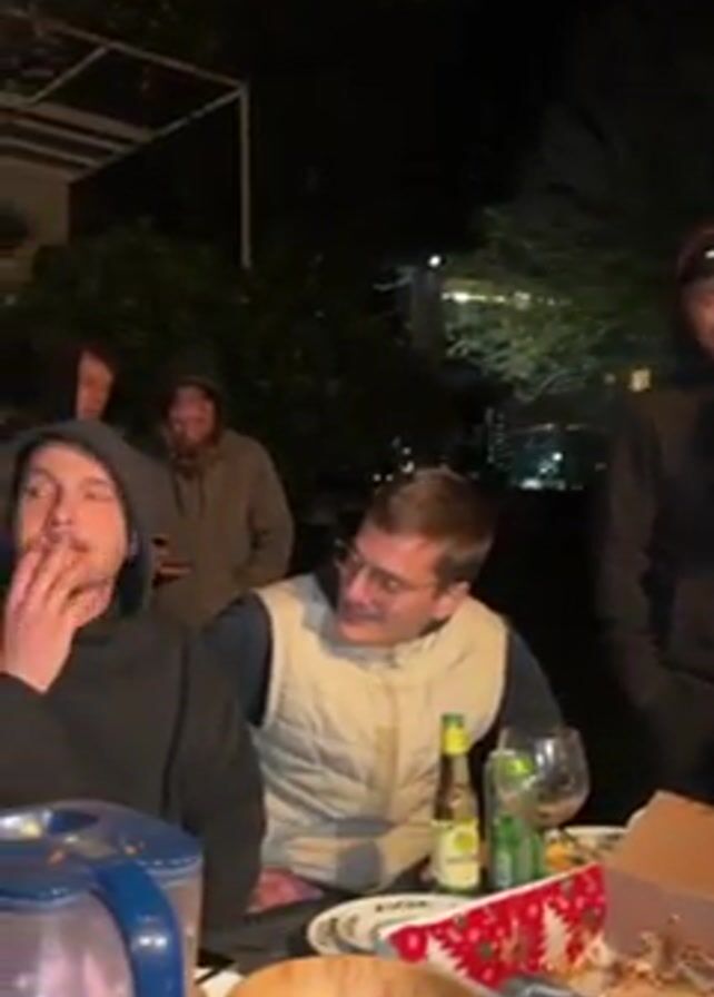 The video captures a gathering of at least seven men at night, seemingly outdoors
