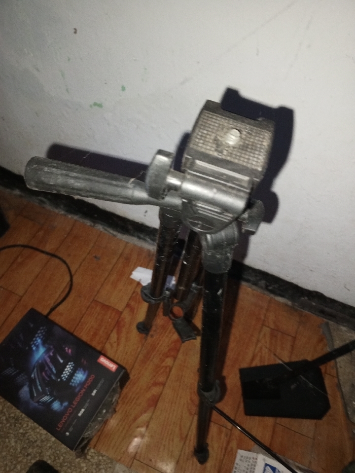 A black tripod stands on a wooden floor against a white wall. The tripod head is gray and features a handle. A Lenovo Legion M300 box sits to the left of the tripod, and a black object is to the right. A small piece of white paper and various wires are also scattered around the tripod's base. The scene is dimly lit, casting shadows behind the tripod.
