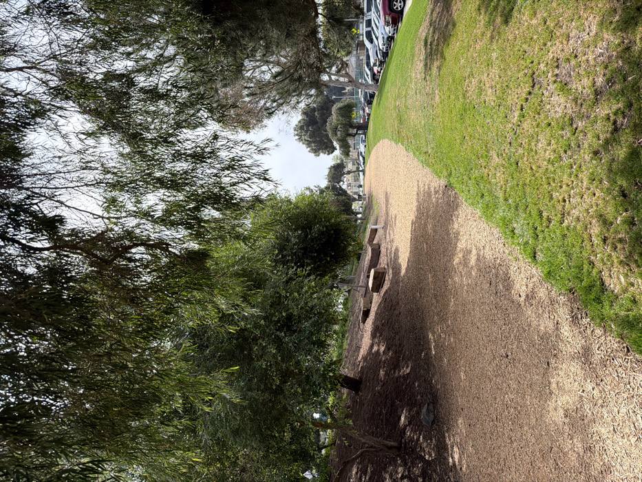 This image depicts a landscaped park area in Manhattan Beach, United States of America, under an overcast sky. A prominent light brown pathway, surfaced with wood chips or mulch, curves from the lower center foreground towards the distant background. To the immediate right of this pathway is a strip of vibrant green grass ascending a gentle slope. To the left, a steeper embankment is covered with darker brown mulch, featuring several mature trees with green foliage and at least three light-colored, rectangular blocks, possibly made of wood or concrete, arranged along the slope. Overhanging branches with narrow, weeping-style green leaves partially obscure the upper portion of the frame. In the mid-to-far background, to the right of the curving pathway, a parking lot is visible, containing a dense line of parked vehicles, including cars and SUVs of various colors (e.g., white, silver, red, dark). No individuals are present in the scene, and no specific actions or interactions are depicted.