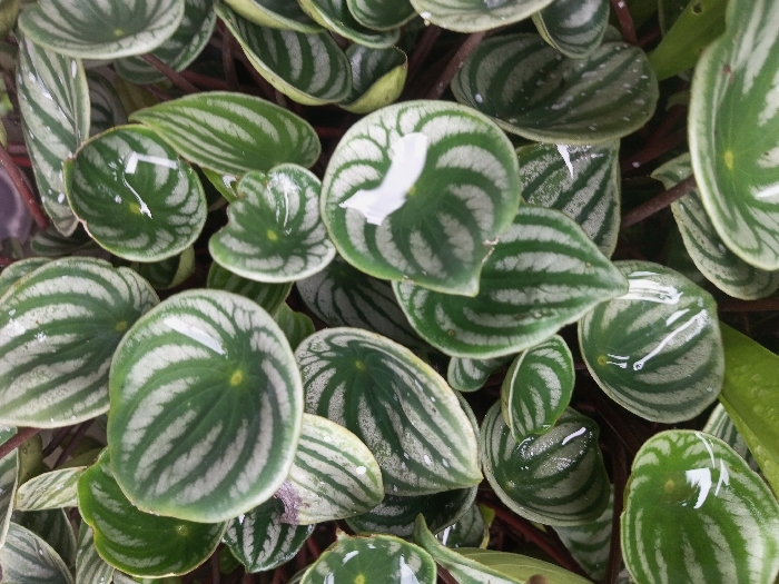 - "A cluster of watermelon peperomia leaves fills the frame, showcasing their distinctive pattern of concentric green and silver stripes" by FM-evJZ13, licensed under CC BY 4.0