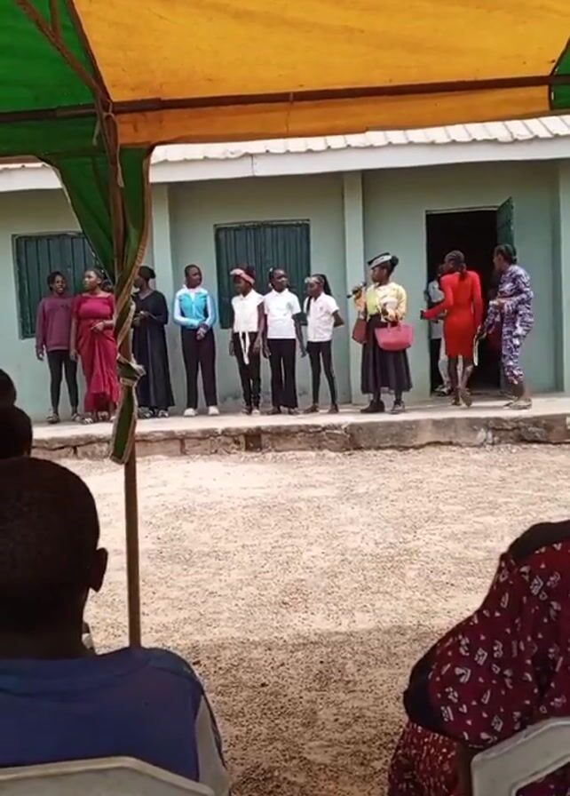 From a partially shaded perspective, the video shows a group of individuals, seemingly students and teachers, assembled outside a light green building. A yellow and green canopy offers a partial view of the outdoor gathering. The students, dressed in a variety of casual and formal attire, stand in a line on a slightly elevated platform in front of the building. A teacher or speaker stands to the right, holding a microphone and addressing the group. Other individuals are present both on the platform and near the open doorway of the building. In the foreground, the backs of several seated attendees are visible. The ground is covered with gravel or small stones. The overall setting suggests an outdoor event, possibly a school function or gathering.