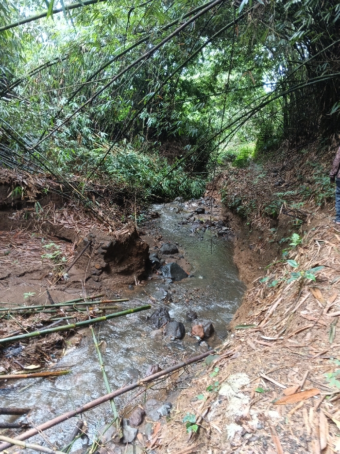 The image depicts a narrow, rocky stream flowing through a densely vegetated area in Situm, Papua New Guinea. The stream occupies the central portion of the frame, with visible flowing water, numerous dark rocks, and some sediment. Several green and brown bamboo poles are partially submerged or resting across the stream bed. The banks on either side are steep, composed of reddish-brown soil, and show clear evidence of erosion, particularly on the left bank where soil undercutting and exposed roots are prominent. Both banks are covered with a layer of dried leaves and organic debris, alongside scattered green foliage. Overhead and along the slopes, dense bamboo groves form a prominent canopy, with numerous bamboo stalks, both standing and fallen, dominating the vegetation. The lower torso and legs of a person are partially visible on the far right edge of the frame, positioned on the right bank. The individual is wearing blue denim pants and a light-colored garment with a dark pattern. The lighting is diffused, consistent with a heavily canopied environment.