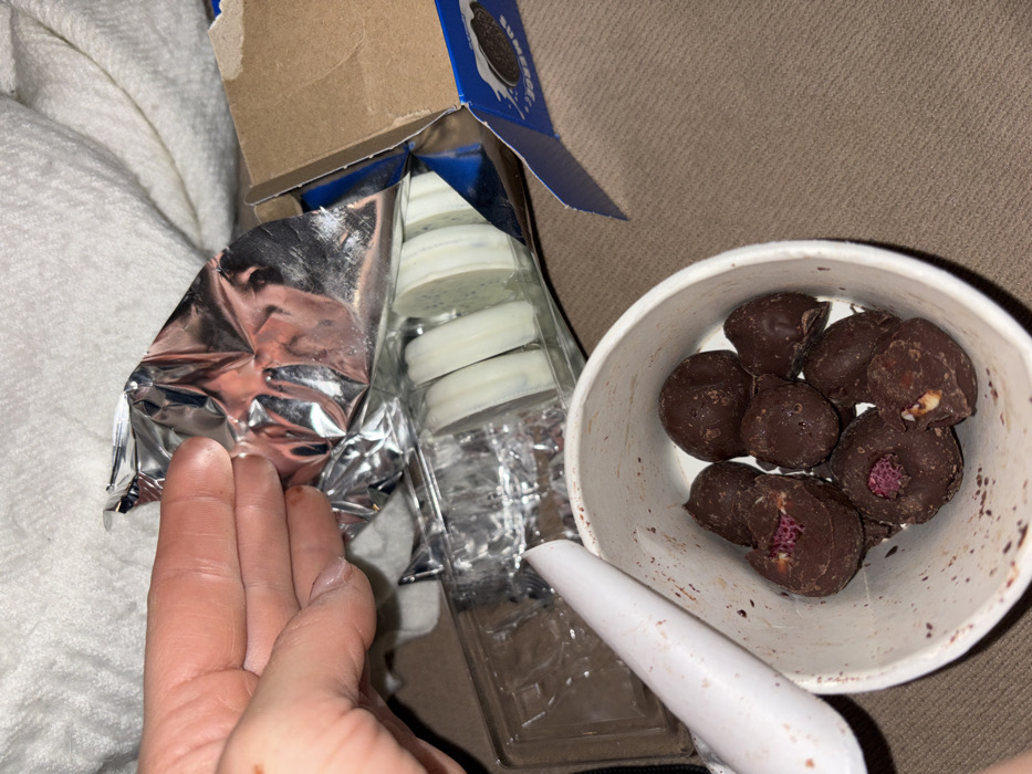 The image displays a box of Summer Oreo Thins with a stack of cookies visible in the package. A partially empty foil wrapper sits beside them. A white paper cup is filled with about eight chocolate-covered treats, some revealing red fruit filling. A hand is also present in the image.