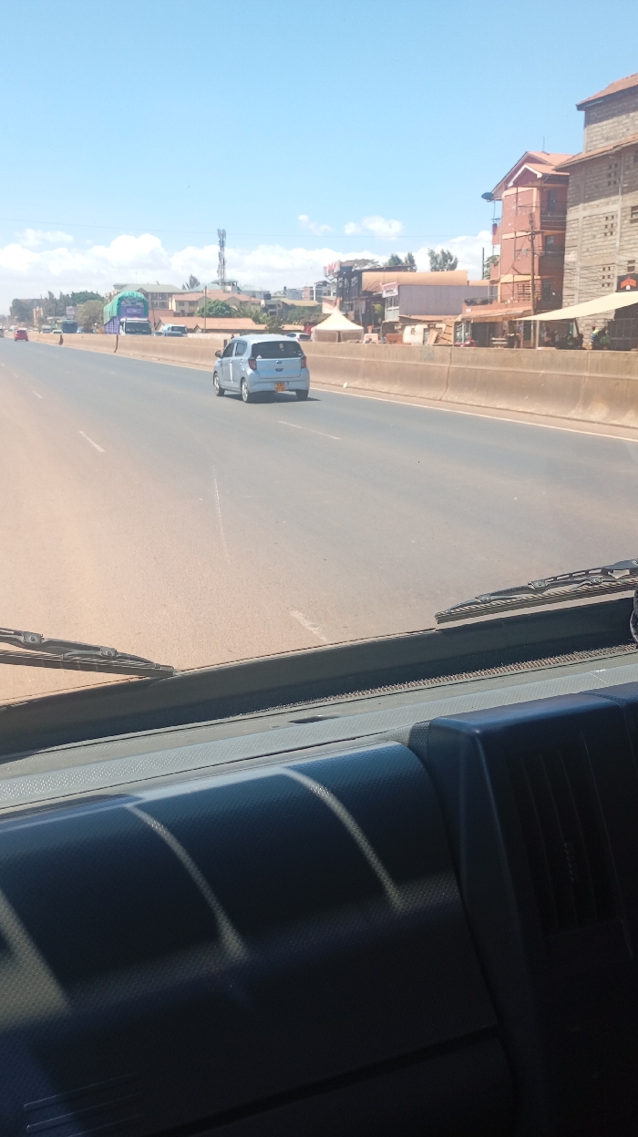 From inside a vehicle, a highway stretches into the distance under a clear, bright sky. A light blue compact car travels ahead in the same direction. Buildings and structures line the right side of the road, including a red-brick building. An antenna or cell tower is visible further in the distance. The vehicle's dashboard and a portion of the windshield are visible in the foreground.