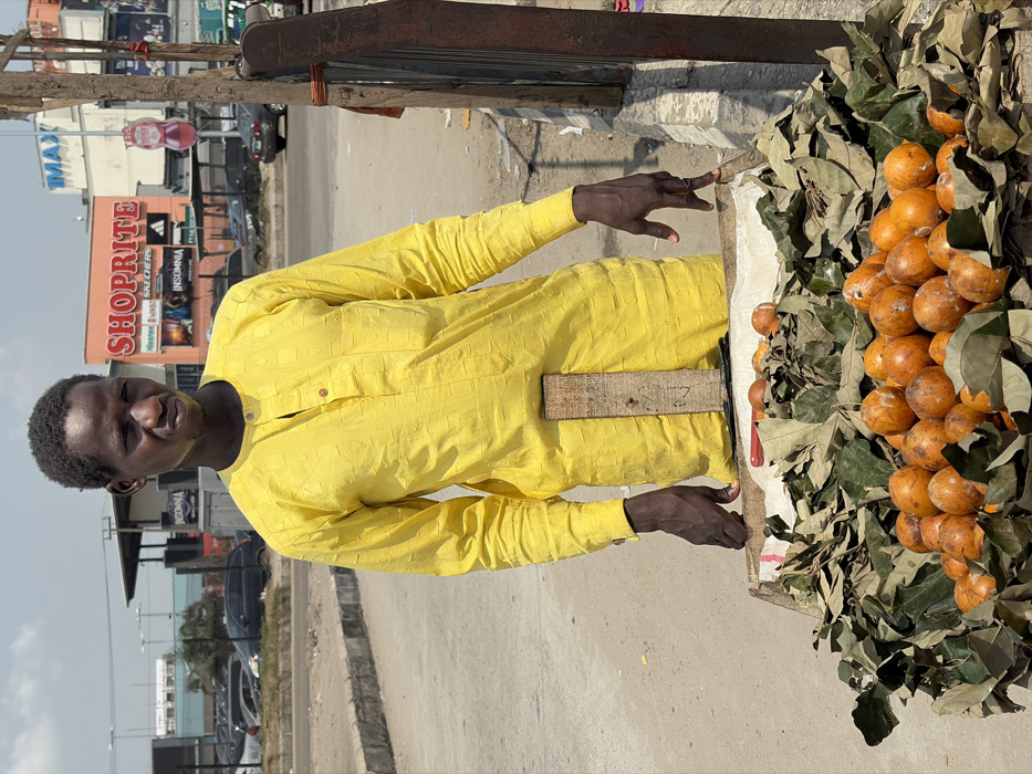 An adult male stands outdoors in Jakande, Nigeria, under bright daylight, positioned behind a wooden market cart