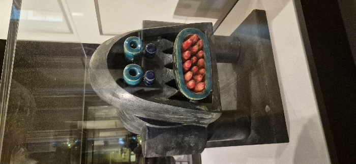 - "A dark, stylized sculpture is displayed upright within a glass exhibition case, which shows visible dust and reflections" by FM-FeWFt2, licensed under CC BY 4.0