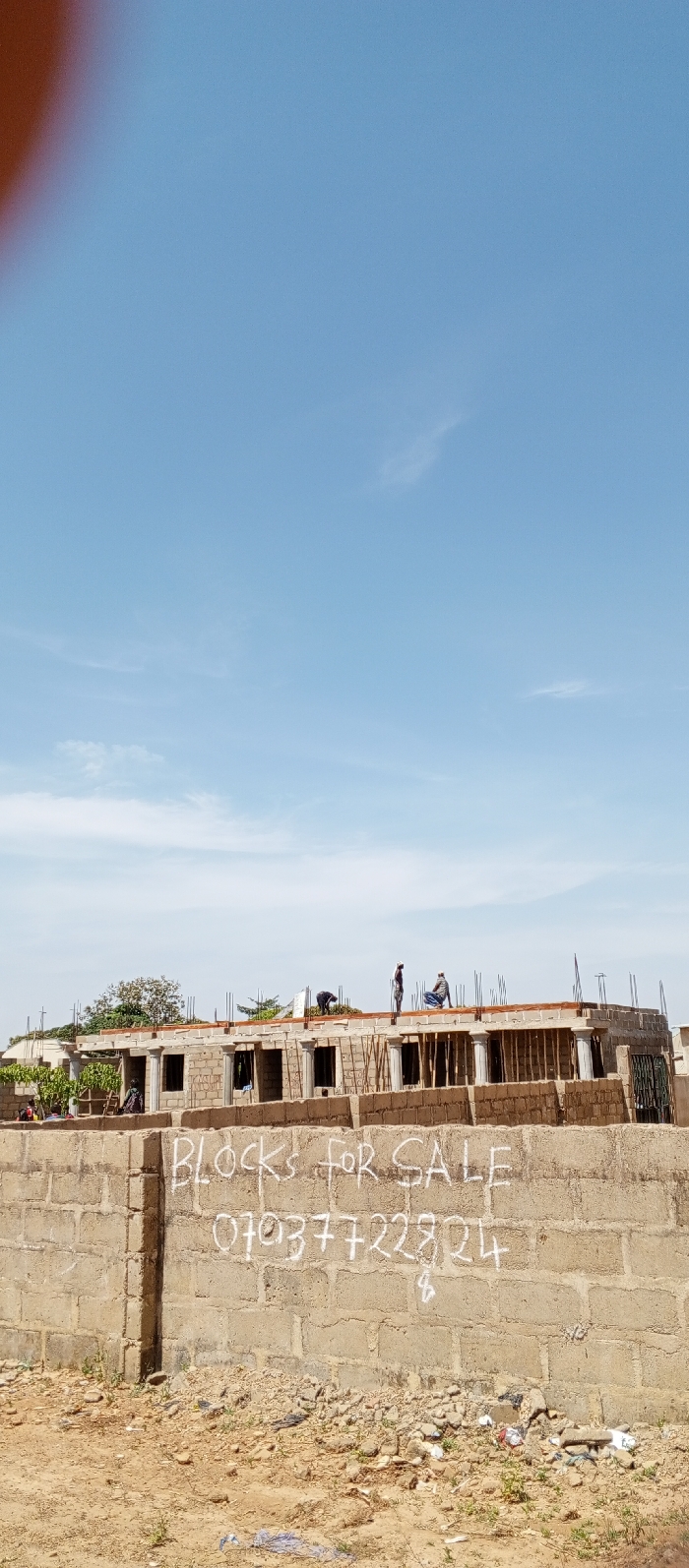 The image depicts a construction scene in Kakau, Nigeria, under a clear blue sky. In the foreground, an unpaved, dusty ground with scattered debris and sparse vegetation leads to a beige concrete block wall. The wall features white spray-painted text reading "BLOCKS FOR SALE" above the phone number "07037722324". Behind this wall, a multi-story building is under construction. The structure consists of concrete block walls with exposed rebar extending upwards from the partially completed roof slab. Several open window and door frames are visible. Four individuals are present on the upper level of the building: one figure on the far left is partially obscured, one central figure is bent over, another figure stands upright towards the right, and a fourth figure is seated or crouched on the far right. Wooden supports are visible within the structure. In the background, distant trees and additional structures are visible under a bright, largely cloudless sky.