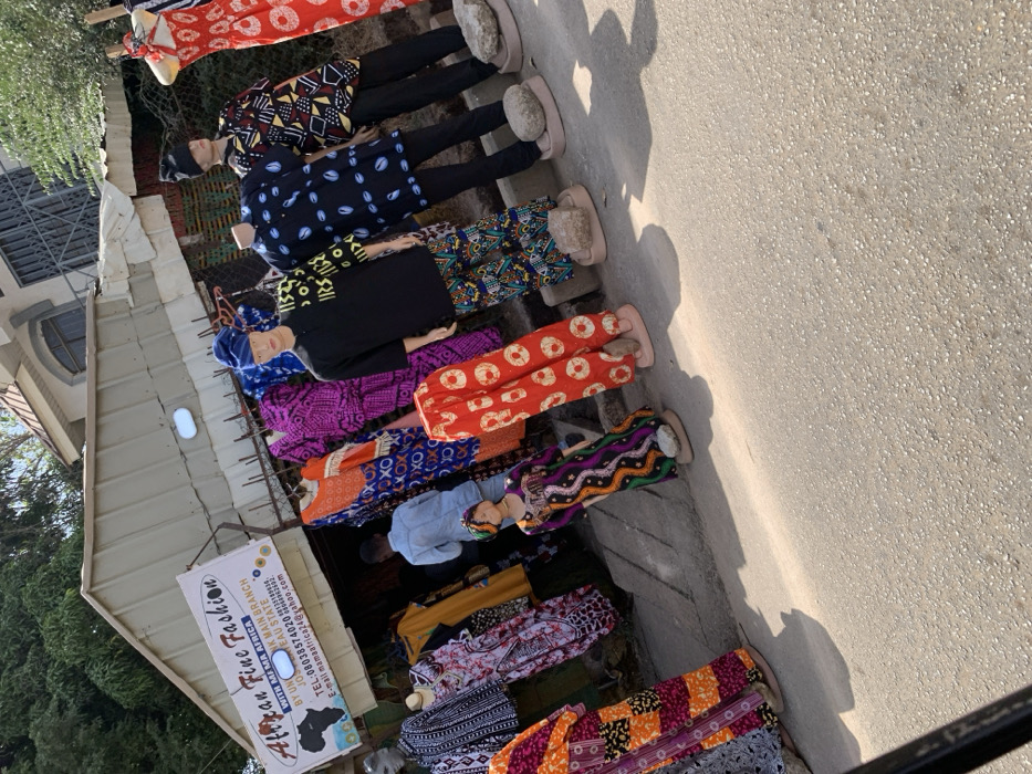 The image depicts an outdoor clothing stall or shop named "African Fine Fashion WITH MI MA AFRICA" in Jos, Plateau State, Nigeria