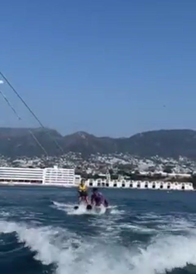 On a bright, sunny day, two people are water skiing on a vast, open sea. The individuals are positioned close to each other, with one appearing to offer support to the other. They are being pulled by a boat, which is the source of the camera's perspective. The wake from the boat and the spray from the water skis create white patterns on the surface of the water. In the background, a coastline is visible. Buildings of various sizes line the shore, and a mountain range rises behind them, partially obscured by the urban landscape. The sky above is a clear, cloudless blue. The scene conveys a sense of leisure and outdoor activity.