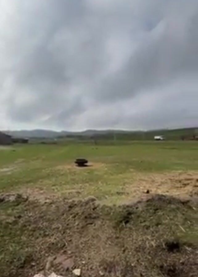 green grassy field in a rural area, under a cloudy sky. In the distance, there are houses and what appears to be a herd of cattle grazing. Closer to the camera, there is an old tire in the middle of the field, and a group of chickens, including a rooster, are pecking at the ground near the left side of the frame. The camera zooms in slightly on the chickens.