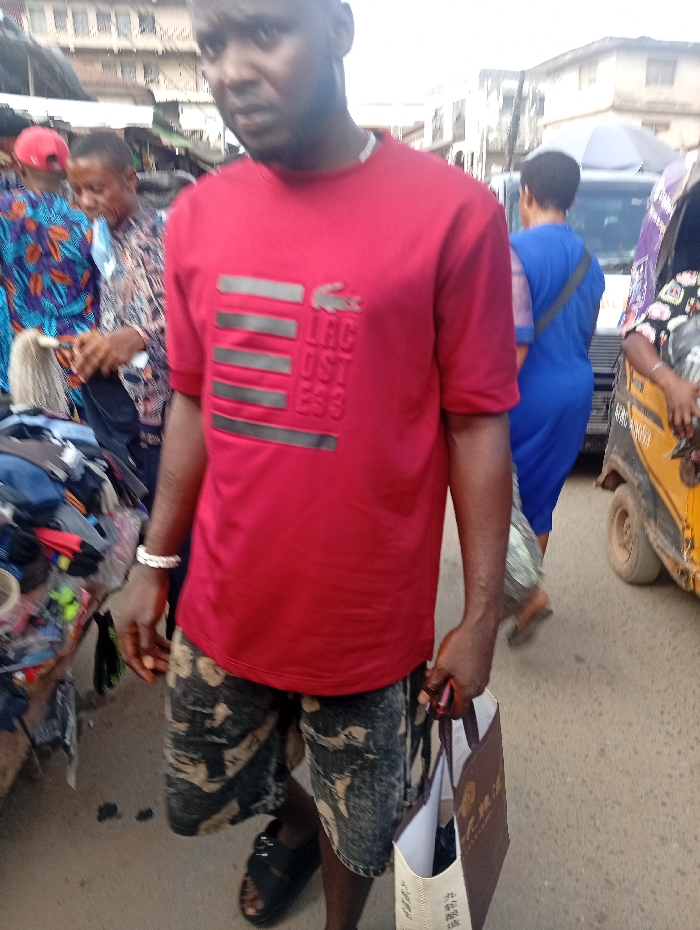 The image depicts an outdoor street market scene in Fegge, Nigeria. A dark-skinned adult male occupies the foreground, facing the camera with a neutral expression. He wears a red short-sleeved t-shirt with a stylized "Lacoste" logo and text, camouflage-patterned shorts, and black open-toed sandals. A white bracelet is visible on his left wrist. In his right hand, he holds a brown and white shopping bag, with a red object (possibly a mobile phone) partially visible alongside it. To the main subject's left, a market stall is visible, displaying folded clothing items. Behind this stall, a male individual with lighter skin wears a blue and tan patterned long-sleeved shirt, holds a white whisk-like object in his left hand, and has a blue face mask positioned around his neck. Further left and partially obscured, another person wears a red cap and blue and orange patterned attire. To the main subject's right, a person in a solid blue dress walks away from the camera, their back visible. Adjacent to them on the far right, a partial view of a yellow motorized rickshaw (keke Napep) is present, with another individual in a patterned garment partially visible beside it. The background features multi-story urban buildings, indicating a densely populated commercial area. The scene is illuminated by natural daylight.