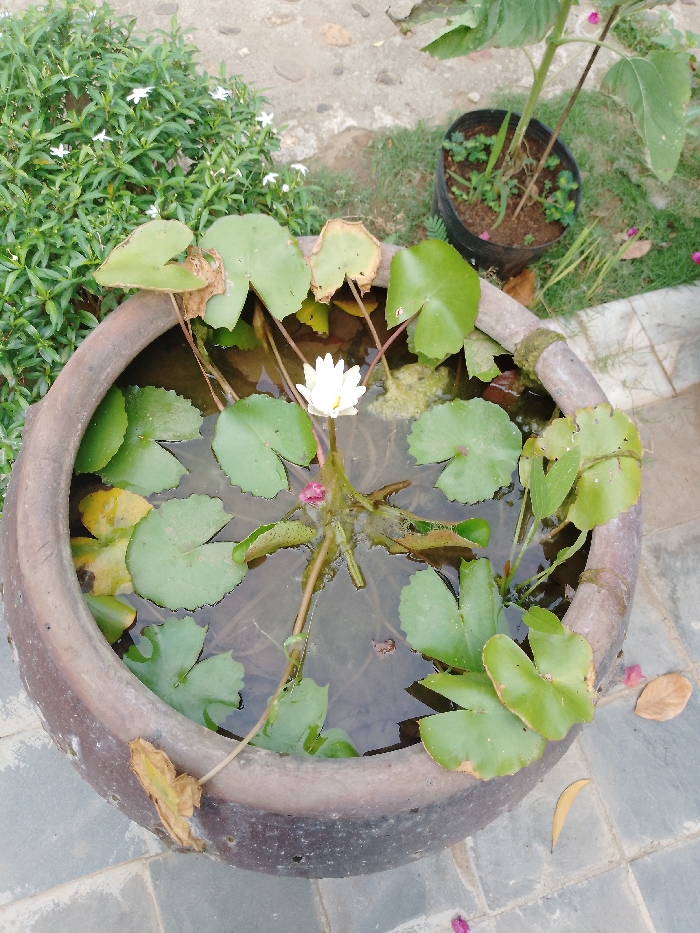 This image depicts an outdoor scene in the city of Trí, Vietnam, focused on a large, weathered, round terracotta pot serving as a pond. Inside the pot, clear water contains numerous green water lily pads of varying sizes, some exhibiting browning edges, and a single, prominently featured white water lily flower in bloom near the center. Submerged stems and some greenish algal growth are visible within the water. The pot rests on a paved surface composed of grey rectangular tiles. To the left of the pot, a dense green bush with small white flowers is present. To the right and slightly behind the pot, a tall green plant, possibly a sunflower, grows within a black plastic nursery pot, situated on a patch of grass and bare earth. Several dried, brown leaves and small pink petals are scattered across the tiled pavement surrounding the main pot. No individuals or specific actions are depicted within the frame.