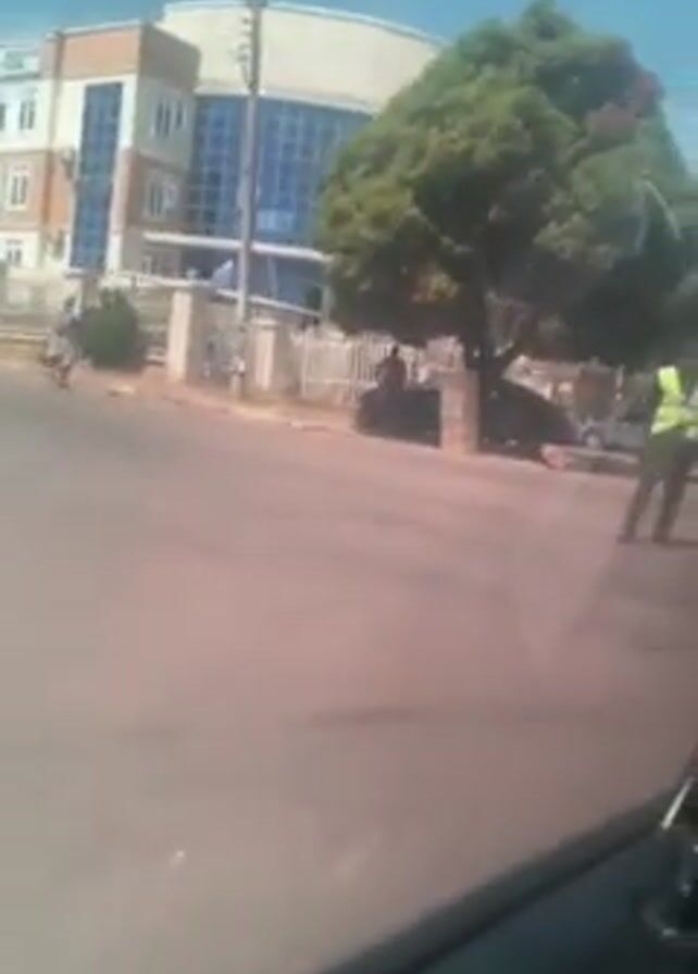 A car is driving down a paved street in a residential area. There is a large building with reflective windows on the left. A tree stands in front of the building. A person wearing a yellow reflective vest is walking on the side of the road, facing the car. Other people are visible in the distance. The video shifts to a view of the car's interior, showing the seats.