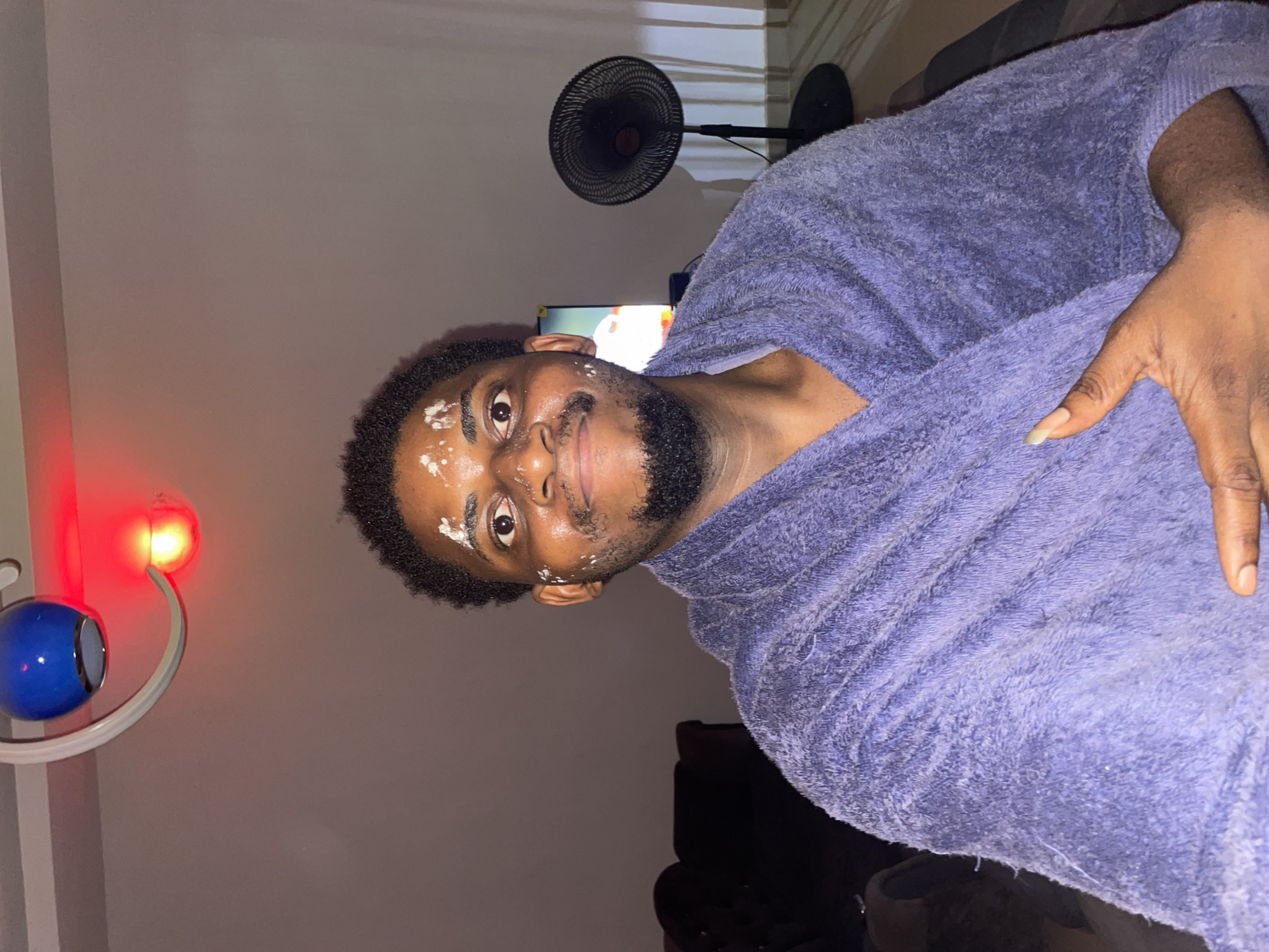 The image depicts an indoor scene featuring a male individual. The subject, a young adult with dark skin, short curly dark hair, and a beard, is positioned centrally, looking directly at the viewer with a slight, closed-mouth smile. His face bears multiple small, white, pasty smudges or spots on his forehead, cheeks, and nose. He is draped in a textured, fluffy purple robe. His right hand is visible in the lower right quadrant, with an elongated, manicured nail on his index finger. The environment appears to be a private residence. The walls are a light, neutral color. Overhead, a decorative light fixture with two lamp shades is visible; one is blue and spherical, the other is red and glowing, casting a warm red hue. In the background to the left, a dark piece of furniture, possibly an armchair or sofa, is partially obscured by shadows. To the right, a black pedestal fan stands upright, and behind it, a television screen displays illuminated content. Vertical light lines, consistent with window blinds or curtains, are present on the wall to the right of the fan. The floor, partially visible in the lower right, shows a light-colored, possibly tiled, pattern. While the context suggests Akwanga, Nigeria, the precise location within the city cannot be confirmed from the visual evidence.