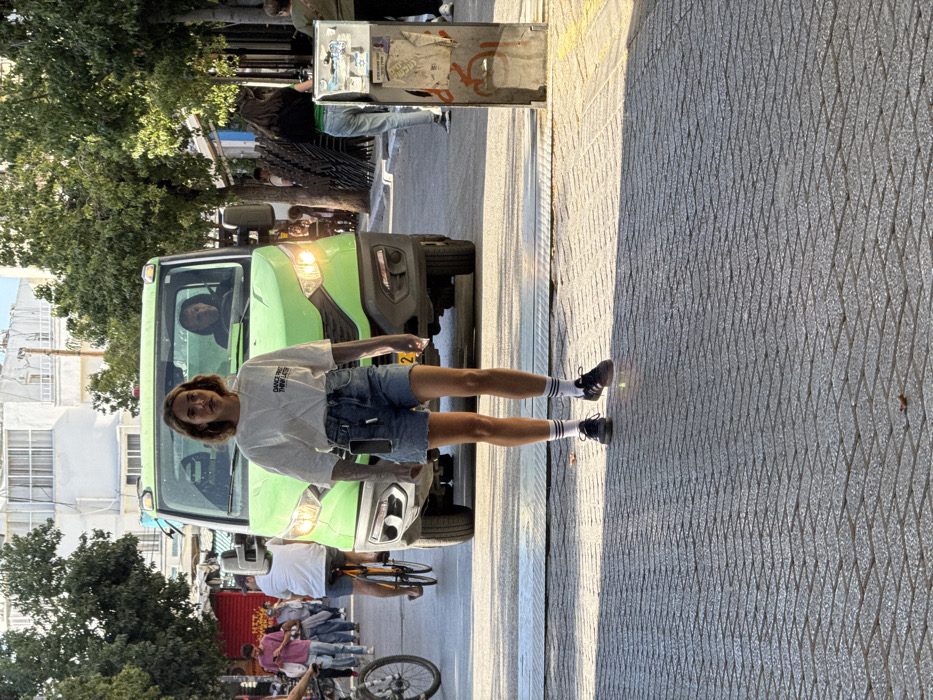 The image displays an urban street scene in Tel Aviv, Israel, under bright daylight. A young woman is positioned centrally in the foreground, facing slightly right of the camera. She has short, curly brown hair and wears a white short-sleeved t-shirt with text, high-waisted denim shorts with frayed hems, white socks with three black stripes, and dark sneakers. A black smartphone with white earbuds hangs from her left shorts pocket. Directly behind the woman, a lime-green utility truck with illuminated headlights is parked or moving slowly, facing the viewer. A driver with dark hair is visible in the truck's cab. To the left of the truck, multiple pedestrians are visible further down the street, along with two individuals on bicycles. Buildings with balconies are discernible in the background. To the right of the truck, a person wearing a dark top and jeans is seen near a stack of dark chairs. A metal street fixture, possibly a public utility box or signpost covered in papers and stickers, stands on the right side of the frame. The ground in the foreground and midground is paved with grey interlocking pavers arranged in a herringbone pattern. A lighter-colored, smooth section of pavement is visible between the woman and the truck. Green trees with dense foliage line both sides of the street. The scene is brightly lit by natural sunlight, casting visible shadows and indicating a clear day.