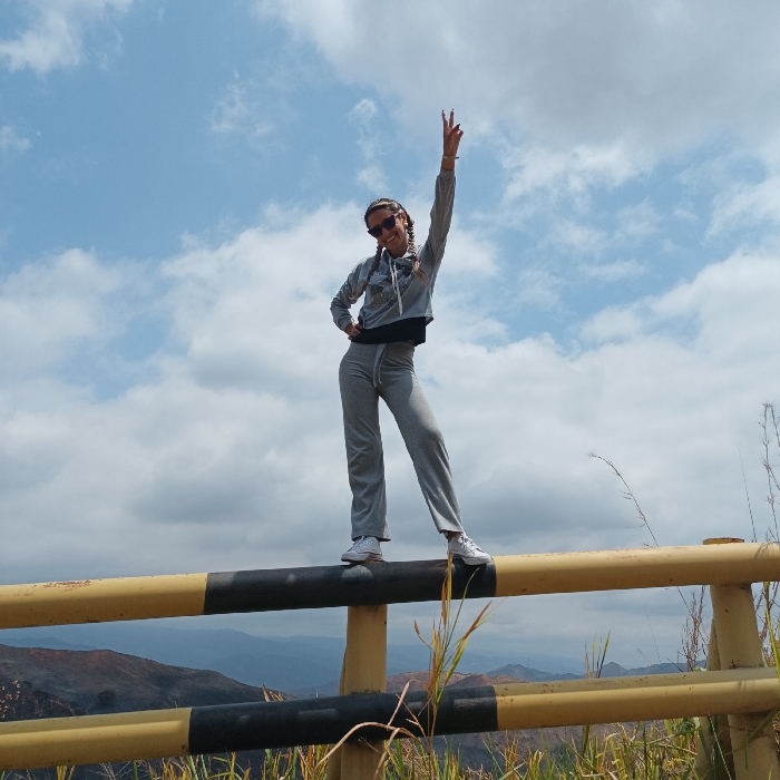An outdoor scene captured under a partly cloudy sky depicts a young female subject standing atop a yellow and black safety barrier, against a backdrop of mountainous terrain. The landscape is consistent with the mountainous regions surrounding Sabaneta, Venezuela, though the exact location within the city cannot be precisely determined from the image. The sole individual, a female, stands centered on the uppermost horizontal bar of the safety barrier, facing the camera. She wears dark sunglasses, a grey hooded sweatshirt adorned with white patterns, a black undershirt, grey sweatpants, and white athletic shoes. Her hair is styled in braids. Her left hand rests on her hip, while her right arm is raised above her head, with her hand forming a "V" sign. The safety barrier, painted yellow with alternating black bands, spans the lower third of the image. Sparse, dry grass and vegetation are visible immediately in front of and behind the barrier. Beyond the barrier, a vast expanse of rolling hills and mountains, exhibiting shades of brown and blue, recedes into the distance under a bright blue sky dotted with scattered white cumulus clouds. The scene is brightly illuminated by natural daylight.