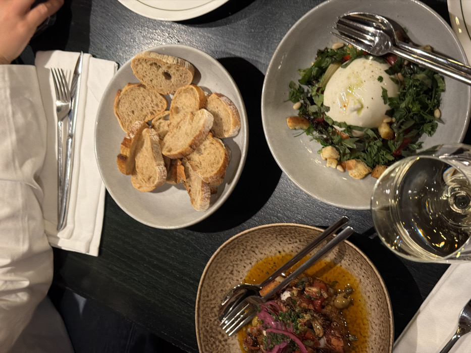 A top-down shot shows a dining table with several dishes. A plate filled with sliced bread sits next to silverware and a white napkin. Another plate holds a burrata salad, drizzled with olive oil, surrounded by greenery, croutons, and pine nuts. Below, a textured bowl contains a dish with tomatoes, olives, and red onions in a sauce, accompanied by serving utensils. A wine glass filled with white wine completes the scene.