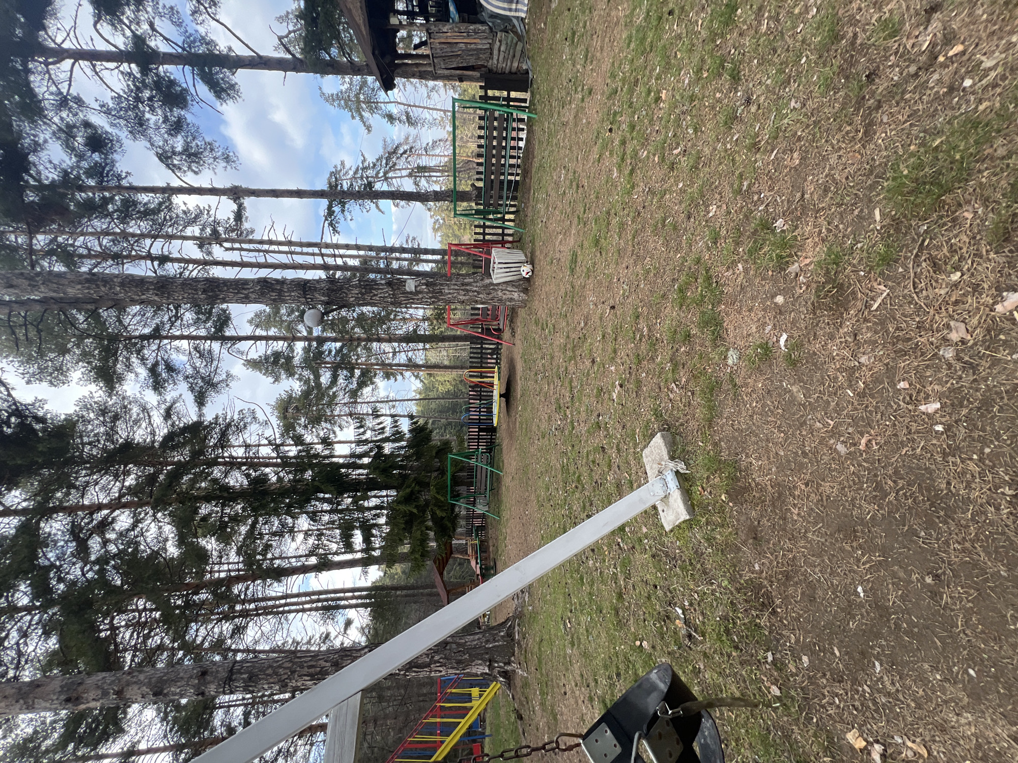 The scene depicts a playground in what appears to be Dedovo, Bulgaria, as suggested by the prompt. Tall, slender trees with green foliage line the left side of the frame, extending upwards towards a partly cloudy sky. The foreground features a swing set, with a portion of a white support beam and a black swing seat visible. The ground is covered with dry grass and fallen leaves. In the background, various playground structures in green, red, and yellow are partially visible. A small wooden structure, possibly a shed or gazebo, can be seen in the upper right corner of the frame. There are no people visible in the image.