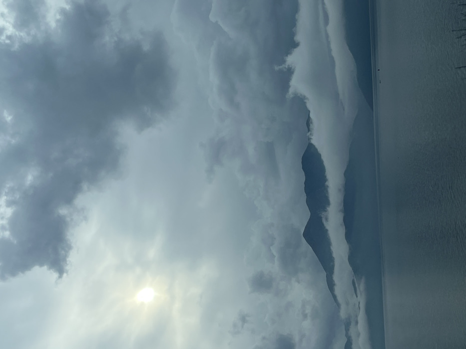 The image presents a natural landscape in the Virpazar region of Montenegro, centered on a large body of water, likely Lake Skadar, and its mountainous surroundings. The upper two-thirds of the frame are occupied by a heavily overcast sky, filled with dense, dark grey clouds. A bright, diffuse sun is visible through a lighter patch of clouds in the upper-left quadrant. A continuous range of dark-toned mountains extends across the middle ground, with their lower and mid-sections partially obscured by thick layers of low-lying clouds and fog. The lower third of the image features a calm, expansive body of water, appearing dark grey and reflecting the ambient light from the sky. Two small, dark, unidentifiable watercraft are present on the water surface in the mid-right portion of the frame. No individuals or specific actions are discernible. The immediate foreground at the bottom edge consists of a dark, indistinct line.