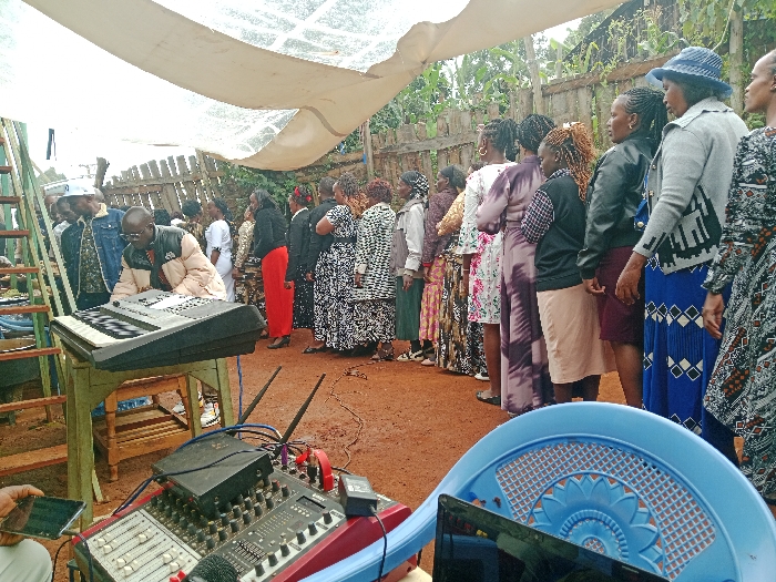 The image displays an outdoor gathering under a white tarp canopy, situated on reddish-brown dirt ground. In the immediate foreground, a light-blue plastic chair with an ornamental backrest partially obscures a dark screen. To its left, an audio mixer with multiple faders and knobs, a microphone, and red headphones are positioned on a red surface. A small black device with two protruding antennas is connected to the mixer. In the mid-ground, a male subject wearing a light-colored jacket and glasses is seated, operating a grey electronic keyboard that rests on a light-green wooden stand. To the right of the keyboard operator, a queue of approximately 15-20 individuals, predominantly women, stands facing right. They are dressed in various casual to semi-formal attire, including patterned dresses, skirts, and jackets. In the background, a rustic wooden fence is visible, with dense green foliage behind it. On the far left, a green metal structure, resembling a ladder or scaffolding, is present, with several male subjects standing nearby. The scene suggests a temporary setup for an event with live music or sound amplification in the city of Unknown, Unknown.