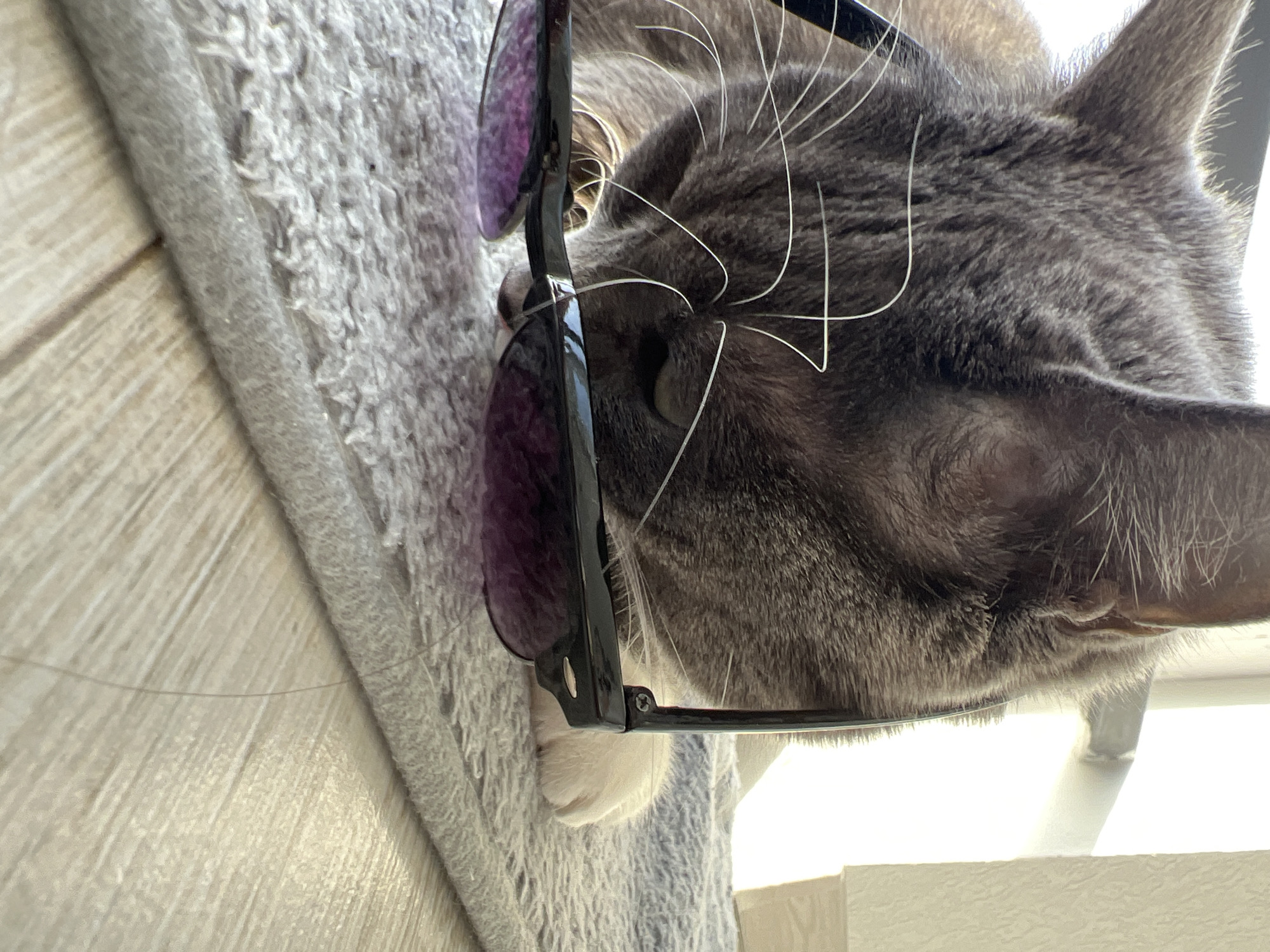 A gray tabby cat is positioned in the foreground, its head angled downward towards a pair of sunglasses. The sunglasses, featuring dark frames and purple lenses, rest partially on the cat's face and are supported by the cat's white paws. The cat's whiskers are prominently visible against its gray fur. A gray, shaggy carpet provides a soft backdrop to the cat and sunglasses. In the background, a blurred white surface, possibly part of a window frame or furniture, is visible. There is no information available to confirm that the image was taken in Tyumen, Russia.
