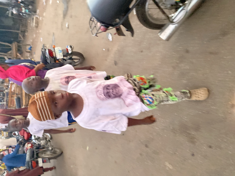 The image depicts a street scene in Lokoja, Nigeria, observed at ground level. In the foreground, a young boy walks forward, slightly blurred, looking towards the viewer's left. He wears a white t-shirt featuring a printed image of a person's face, patterned trousers with green, red, and blue fabric embellishments, and light brown Clogs footwear. A brown and white striped cap covers his head. Directly behind him, two other young boys also walk forward. They both wear white t-shirts with similar printed images of faces. The boy immediately behind the foreground subject appears to wear dark shorts. The background is populated with several individuals and vehicles, indicating a busy urban environment, likely a market street. Partially visible figures include an adult in a blue shirt on a motorcycle to the far left, and an individual in a bright pink head covering further back to the right. Multiple motorcycles (okadas) are present, some parked or being operated, including a silver exhaust pipe visible in the lower right foreground. The ground is a paved surface, and some scattered debris is visible. The lighting suggests daytime conditions.