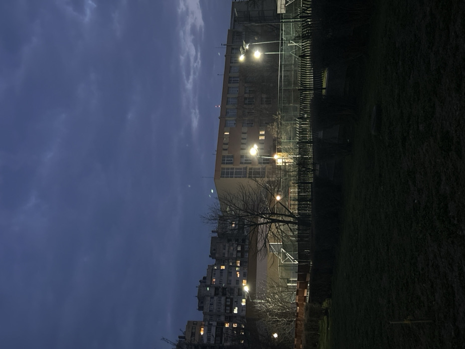 The image depicts an urban environment at dusk or night in Silistra, Bulgaria. In the foreground, a dark, unlit grassy area, likely a park or common ground, is visible, bordered by a dense line of dark, low-lying bushes. A dark metal fence with a distinctive curved upper edge separates the grassy area from the midground. Beyond the fence, a sports court, possibly for basketball or tennis, is brightly illuminated by three prominent, tall streetlights featuring white LED-style fixtures. A basketball hoop is partially visible on the right side of the court. Several bare, deciduous trees are present near the court and between buildings. To the right, a light-colored, four-story building with multiple windows, some internally lit, stands adjacent to the court. In the background, to the left, a dense cluster of multi-story, older residential apartment buildings with numerous illuminated windows indicates active occupancy. The sky above is dark blue-grey and heavily overcast. No individuals are visible, and no actions or interactions are depicted within the scene.
