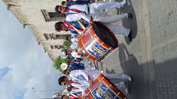 A band parades on a cobblestone street beneath a partially cloudy sky. Members wear white pants, shirts, and black shoes. Drummers carry large drums with red rims and ornate blue and gold designs. Some musicians play trumpets. The band members wear blue vests and some wear red sashes. A stone building with barred windows is visible in the background.