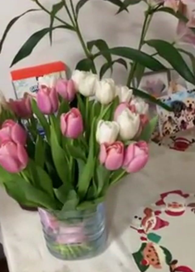 table with two vases of flowers. One vase contains white and pink tulips. The other vase has pink and white lilies. The lilies are taller than the tulips. The table has a white patterned tablecloth with a circular placemat featuring images of Santa Claus and elves. In the background, there's a box labeled "Grazioso," a framed picture of puppies, and a black and red object that could be a bag. A voice in the background mentions "parrots" and "he's knocking."