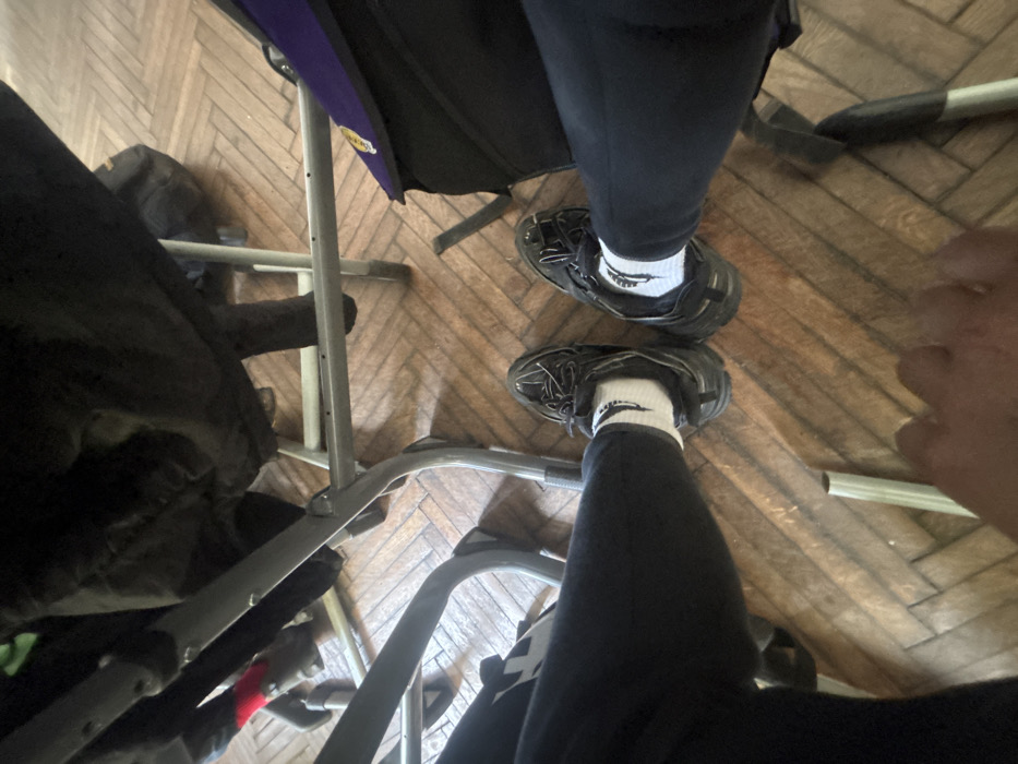 A high-angle view captures a pair of feet wearing black athletic shoes with white laces and white ankle socks displaying a dark, stylized graphic, positioned on a worn herringbone parquet floor within an indoor setting in Sofia, Bulgaria. The individual's legs are covered by dark leggings or trousers. In the immediate foreground, hands are partially visible, resting on a light-colored metal bar. The scene is framed by grey metal furniture structures, consistent with chair or desk legs, with dark fabric items draped over them, including a purple and black bag with a yellow emblem on the right. Additional obscured legs and dark objects are discernible in the background, indicating multiple occupants or items of furniture within the space.