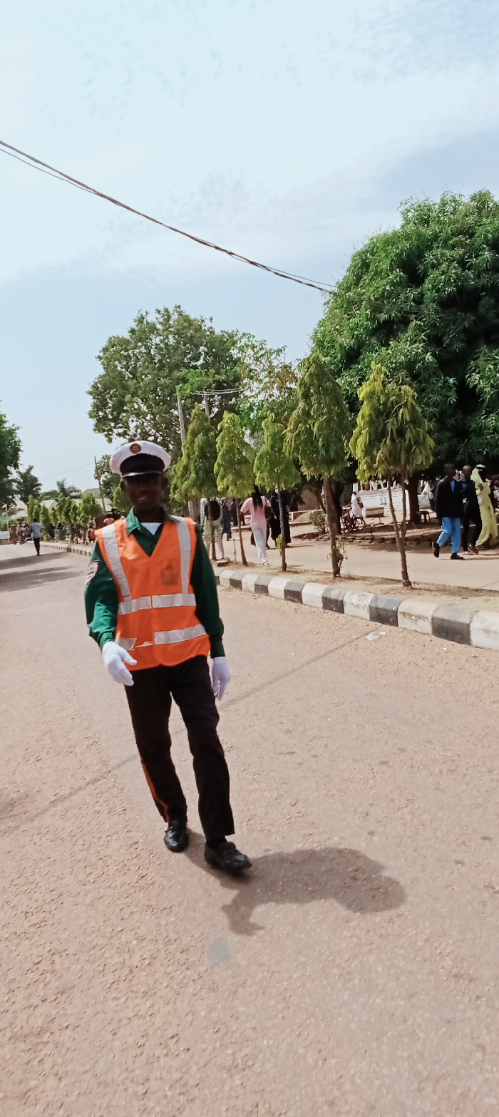 The scene depicts an outdoor environment in the city of Kabala, Nigeria, under a light blue sky with scattered clouds. A male individual, appearing to be an adult, stands centrally on a light-colored paved surface. He wears a dark green long-sleeved shirt, an orange high-visibility vest with reflective silver stripes, black trousers, and black dress shoes. White gloves cover his hands, and a white peaked cap with a dark circular emblem is on his head. He faces forward with a slight smile. His shadow is cast to his lower right on the ground. To the right of the paved surface, a black and white striped curb separates the road from a raised area featuring a row of slender, conical green trees. Denser, larger green trees are visible behind these smaller trees. Several pedestrians are present in the background, walking on the raised area to the right and further down the paved surface to the left. A thin, dark cable or wire spans horizontally across the upper sky.