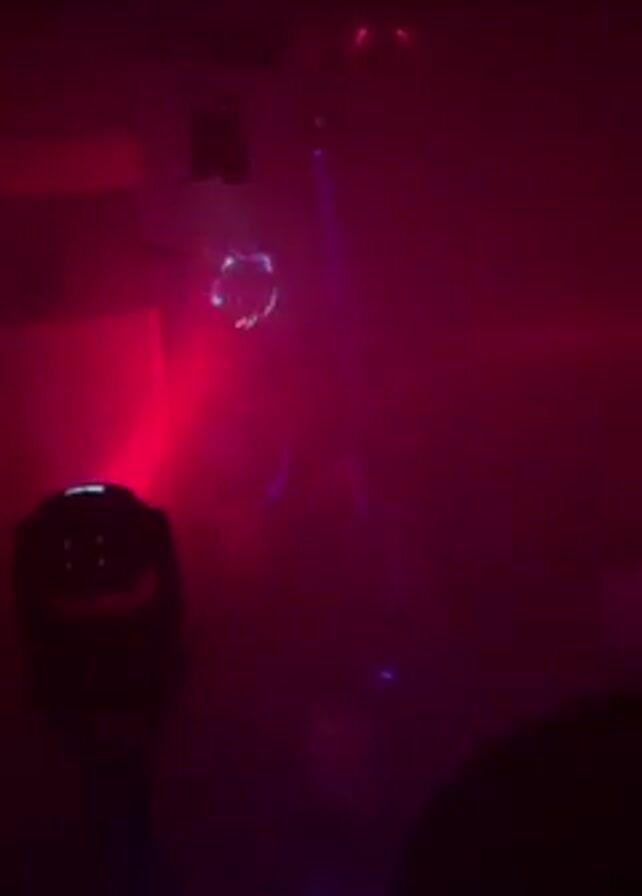The video depicts a dimly lit, enclosed space, possibly a room or a small club, with a red ambient light dominating the scene