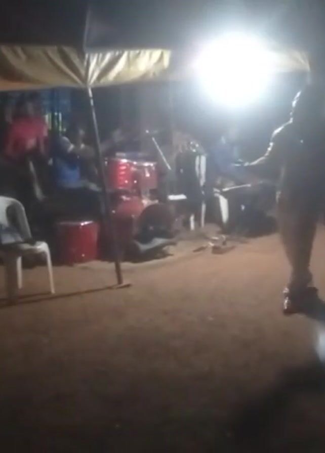 The video depicts a dimly lit outdoor setting at night. A small stage area is covered by a tent, under which a band appears to be performing. A bright light illuminates the stage, making it difficult to discern specific details about the musicians or their instruments beyond the presence of a drum set. Two silhouetted figures stand in the foreground, one facing the stage, while the other walks towards it. Several white plastic chairs are situated near the stage area, suggesting an audience is present. The ground appears to be dirt or gravel. A large speaker is positioned to the right of the stage.