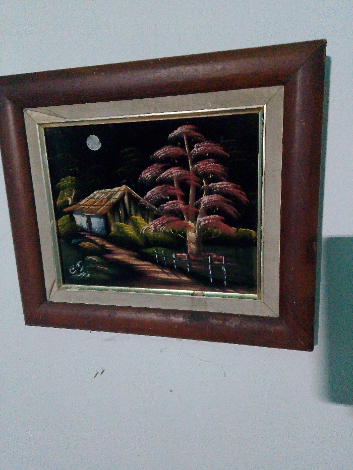 A framed oil painting depicts a moonlit rural scene