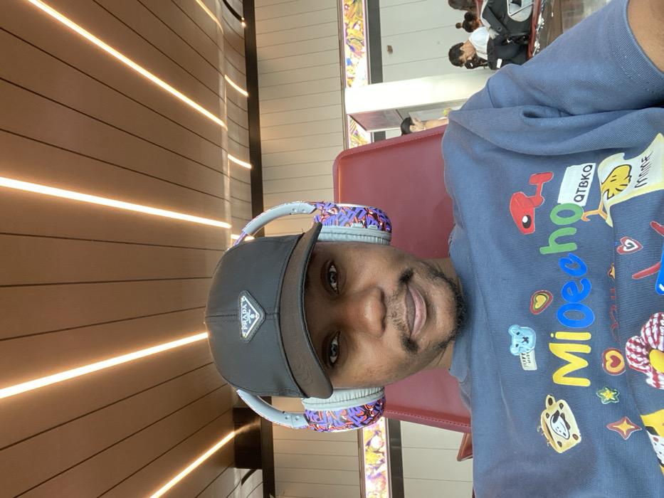 A selfie shows a man wearing a backwards black Prada cap and patterned headphones. He’s wearing a navy blue sweatshirt with colorful cartoon images. He’s seated in a red chair with a light-colored wall featuring horizontal light strips in the background. In the distance, several individuals sit near a glass display case. The image is rotated 90 degrees clockwise.