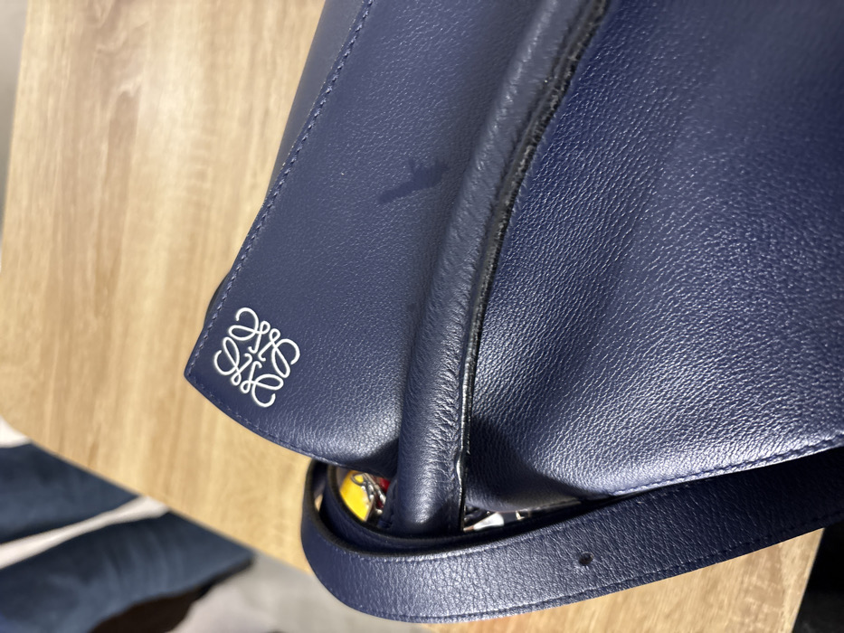 A close-up captures a deep blue leather handbag featuring the Loewe anagram logo in white at the flap's corner