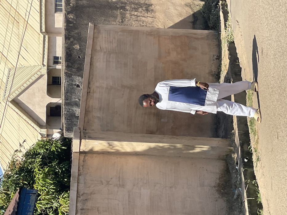 An adult male with dark skin, a black and grey beard, and short hair walks right-to-left on a paved road in Jos, Nigeria, under direct sunlight