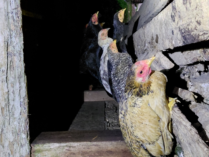 - "At least five domestic chickens are depicted roosting on rough, weathered wooden planks in Blang Pohroh, Indonesia" by FM-ttalh2, licensed under CC BY 4.0