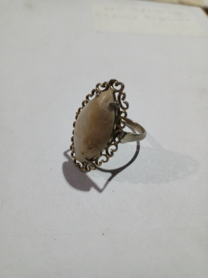 The scene depicts a single antique-style finger ring positioned on a flat, white, or light-colored surface. The location in the city of Phakeo, Laos, cannot be determined from the provided image. The ring features a large, oval-shaped cabochon stone, light beige to pale cream in color with visible natural inclusions or striations. This stone is set within an ornate, possibly tarnished brass or gold-colored metal bezel with a filigree design comprising scrolled elements. The ring's band is a silver-colored metal, exhibiting some wear and minor surface imperfections. A faint "900" marking is visible on the exterior of the band. The object is illuminated by a directional light source from the upper left, casting a distinct, dark shadow of the ring towards the lower right. The background consists of the same light-colored surface, out of focus, with subtle texture and faint horizontal lines in the upper portion. No individuals, actions, or interactions are present.
