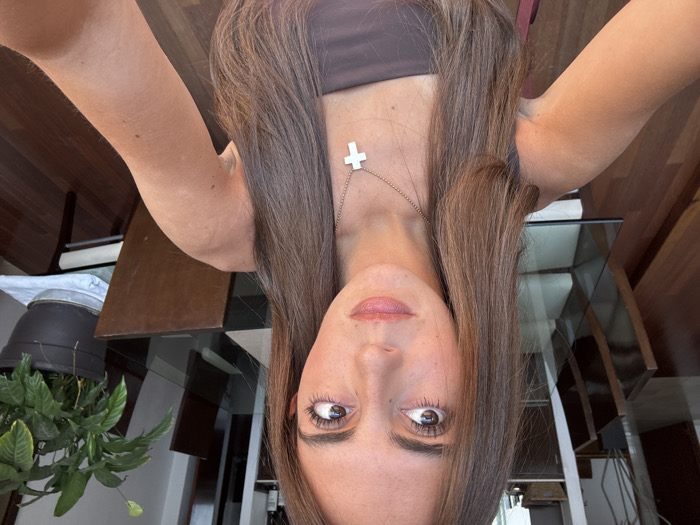 A woman takes a selfie from an upside-down perspective. Her long, straight brown hair frames her face, and she wears a brown top. A cross necklace hangs around her neck. She has brown eyes and fair skin. The background reveals a wooden table, a glass-topped display shelf, and a potted plant with green leaves. The overall setting appears to be an indoor space with natural light.