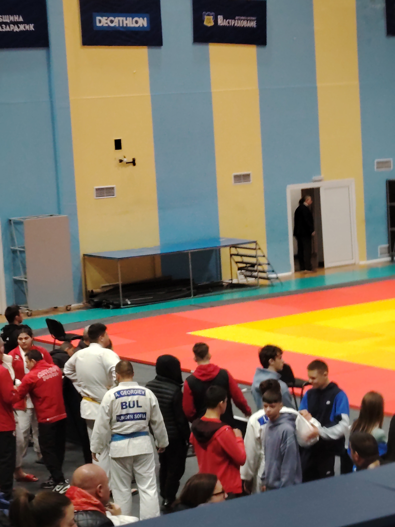 interior of a sports venue in Pazardzhik, Bulgaria. The walls have vertical stripes of yellow and light blue. Banners with the words "DECATHLON" and "ЗАСТРАХОВАНЕ" are visible. A judo mat with red and yellow sections is in the center. Many people, including judo athletes in white and red uniforms, are present. One athlete has "A. GEORGIEV BUL UMDEN SOFIA" printed on the back of their uniform. A man is standing in the doorway in the background.