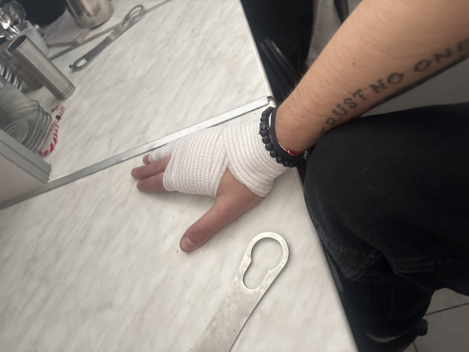 The scene depicts a person's left hand and forearm resting on a light-colored countertop in an indoor environment, likely a kitchen or bar. The left hand is wrapped in a white elastic bandage, covering the back of the hand and wrist, with the thumb and fingertips exposed. Two beaded bracelets, one entirely black and another featuring black beads with a single red bead, are worn on the wrist. The visible portion of the forearm displays a tattoo reading "TRUST NO ONE" in block letters along its inner surface. Dark-colored fabric, consistent with trousers, is visible in the lower left quadrant of the image. To the left of the bandaged hand, a metallic bar tool, resembling a bottle opener, rests on the countertop. In the background, on the right side of the counter, several metallic kitchen or bar implements, including shakers and tongs, are discernible. There are no visual markers within the image to identify a specific location within Sofia, Bulgaria.