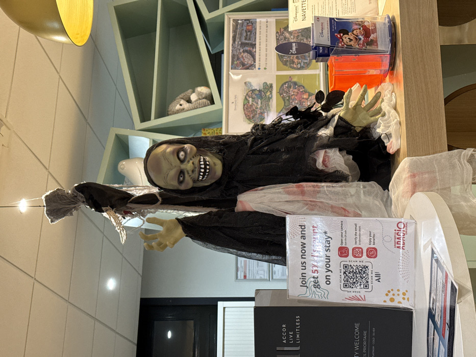 The image depicts a hotel lobby or reception area, specifically the Aparthotel Adagio Original in Serris, France, identifiable by signage. A Halloween-themed decorative figure, resembling a Grim Reaper or skeletal ghoul, is suspended from the ceiling in the central foreground. This figure features a greenish-brown skull-like mask with wide, white eyes and an exposed, toothy grin. It is clad in tattered black fabric and shredded white cloth, some of which is stained with red, mimicking blood. One yellowish-green plastic hand with long fingers is raised. To the left, a light-colored counter or table displays an "ACCOR LIVE LIMITLESS" sign (partially visible) and a clear plastic stand holding a white sign. This sign advertises "Join us now and get 5% discount on your stay," featuring a QR code and instructions for the Aparthotel Adagio Original. To the right, behind the central figure, a wooden counter is visible. Above this counter, light blue, geometrically angled shelves hold various items, including a white, abstract ceramic object on an upper shelf and a grey stuffed animal, possibly a rabbit, nestled on a lower shelf. On the wooden counter itself, a framed display shows four sections, appearing to be maps or illustrations of Disneyland Paris, with "Disneyland Paris" text visible above. Adjacent to this is a blue elliptical sign bearing the Disneyland Paris logo. A clear plastic organizer holds multiple pamphlets, one of which prominently features Minnie Mouse. A sign within this section indicates "Disney navette" (Disneyland shuttle). An orange plastic container is also present on the counter. The ceiling consists of white suspended panels with recessed lighting fixtures. A single yellow, bell-shaped pendant lamp hangs from the ceiling on the upper right. In the background left, a dark window or partition with a light reflection is visible, below which are vertical white slats. No people are present in the scene.