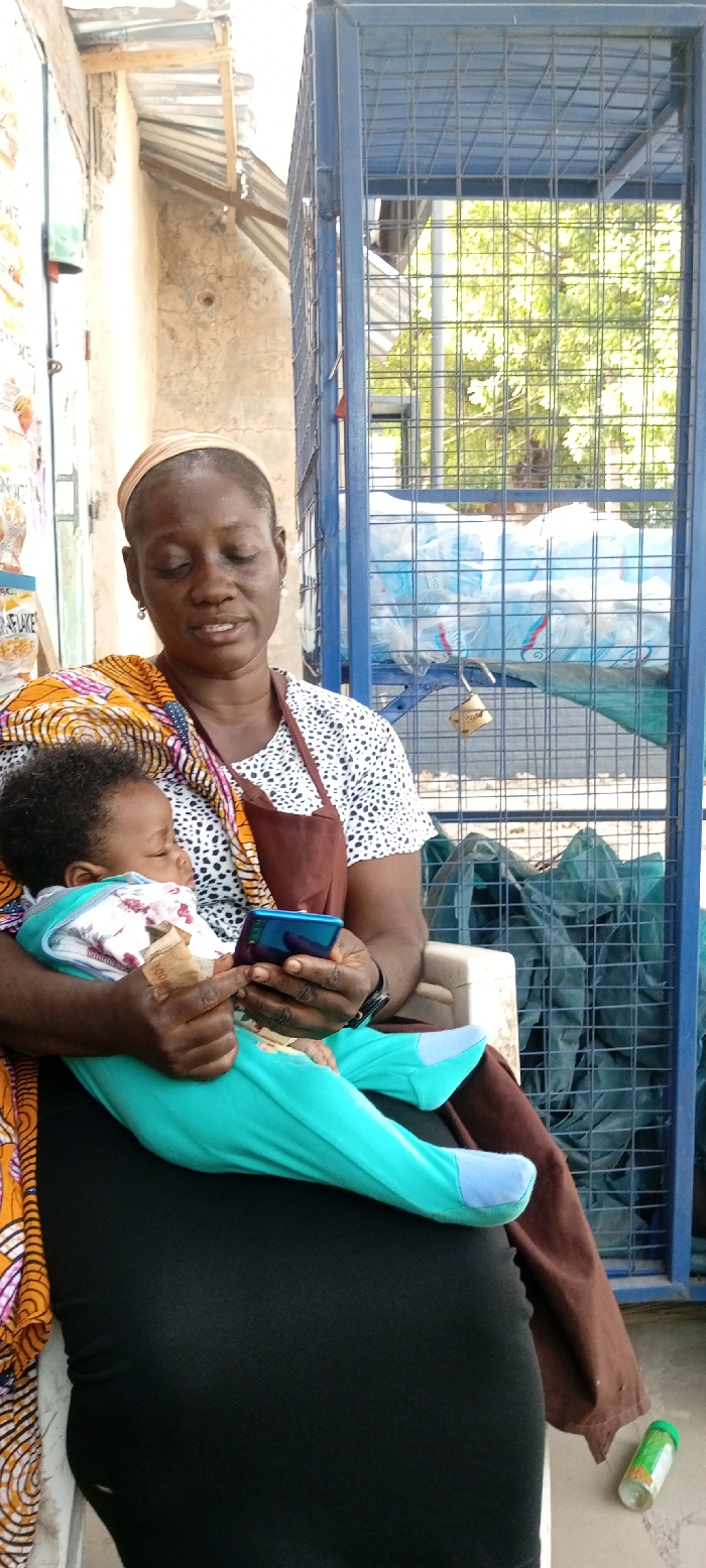 In the city of Aviation Quarters, Nigeria, an adult female is depicted seated, facing forward, holding an infant