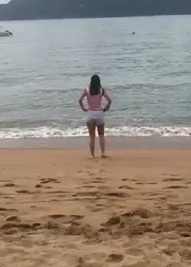 A woman in a light pink tank top and light-colored shorts walks towards the ocean at a beach